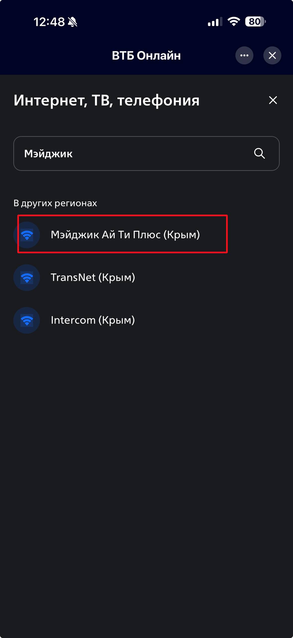 3. Наберите в строке поиска начало наименования провайдера - кнопка «Мэйджик Ай Ти Плюс (Крым)»